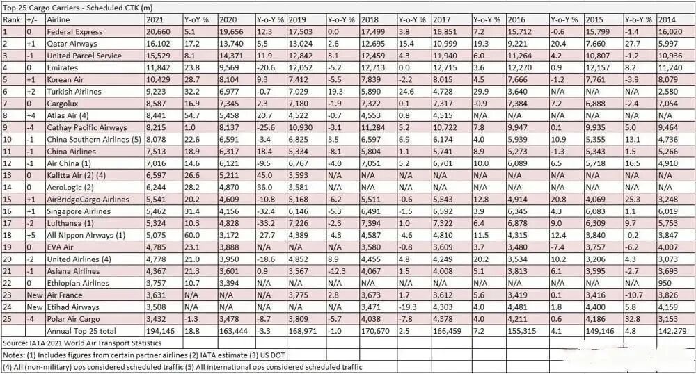 尽管过去一年一直都受到运力有限、工作人员短缺、与疫情有关的拥堵的不利影响,整个供应链面临诸多限制,但前25家货运航空公司去年成功地满足了全球航空货运的需求,货运量同比增长了18.8%。