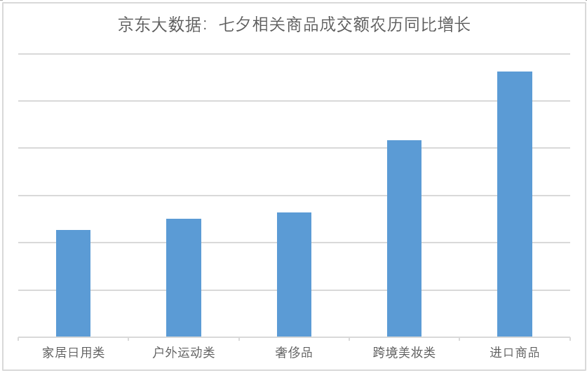 据京东大数据,七夕前,家居、户外、奢侈品等商品品类销售都有2-3成左右的增长,而跨境和进口商品中,饰品和包包最受欢迎。据京东时尚居家平台事业群数据,购买七夕相关商品的消费者中,85-95后用户比去年有大幅增长,比全站平均数据高20%左右,增长最快的省区是辽宁、河南和四川。