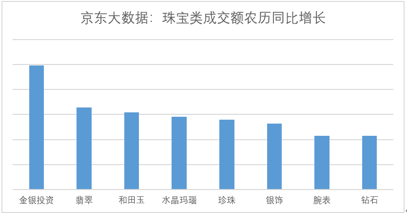 正所谓“一道鹊桥横渺渺,千声玉佩过玲玲”,七夕佳节之际,带有中国传统文化韵味的翡翠类珠宝最受欢迎,销售额同比增长53%,同时带动的还有水晶玛瑙、珍珠、和田玉等,均有4-5成的增长。