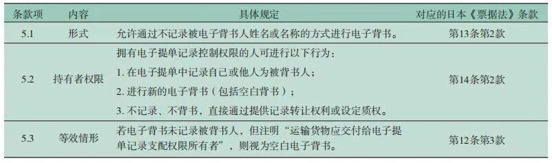 日本《票据法》不仅承认记名背书,还承认空白背书,即不显示被背书人姓名,或仅由背书人签名或记名盖章的背书形式,并对空白背书的相关规则作出了具体规定。为将这些规定适用于电子提单记录,日本《修正草案》对照日本《票据法》设立了一系列规则 ( 如表1所示 )。