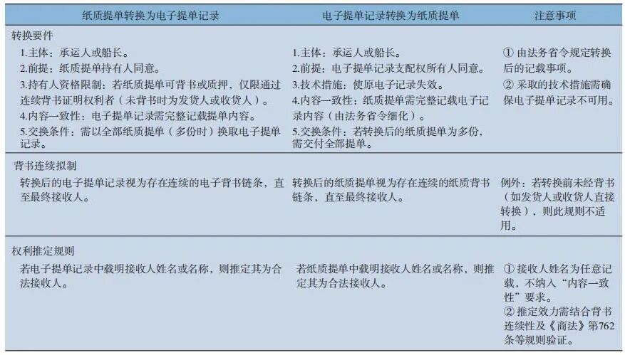 从表3可以看出,日本《修正草案》关于提单媒介转换条件的规定与MLETR及我国《海商法 ( 修订草案 )》基本一致,主要涵盖以下要素:需经当事人合意,转换后原纸质提单或电子提单记录即告失效,转换信息需明确标注,转换前后记载内容需保持同一性。值得注意的是,日本《修正草案》创新性地增设了权利推定规则与背书连续性拟制条款。在权利推定规则方面,日本《修正草案》借鉴了日本《民法》第520条第四款⑦关于指示证券权利推定的立法技术,明确规定:若转换后的电子提单记录 ( 纸质提单 ) 载明接收人信息,则推定该接收人为合法权利人。在背书连续性拟制条款方面,日本《修正草案》针对纸质提单转换为电子提单记录和电子提单记录转换为纸质提单两种情形,设计了完整的连续性拟制规则。该规则规定转换后的电子提单记录 ( 纸质提单 ) 应视为存在连续的电子背书 ( 纸质背书 ) 链条,但若转换前不存在背书关系,则不得进行拟制。