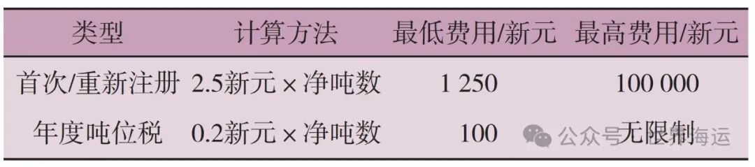 按照新加坡《商业航运法》,船舶首次登记注册或重新注册均需按2.5新元/净吨的标准缴纳费用,最低不低于1 250新元,最高不超过100 000新元。除此之外,每年还需要缴纳0.2新元/净吨的吨位税。⑧新加坡船舶的吨位年费计算方法见表4。