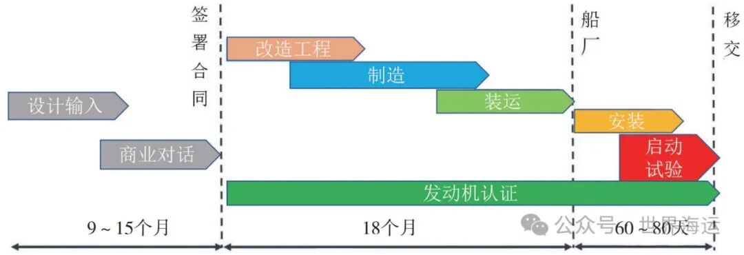 船用发动机替代燃料改装的设计、认证和入级规范处于不同的发展阶段,面临技术和合规等多方面的挑战。LR开发了基于风险的认证 ( RBC ) 发动机改装流程,包括风险和安全陈述、风险评估、支持性研究、最终设计评估、建造和在役评估等五个部分。MAN ES可提供主发动机改装、燃气供应系统 ( FGSS ) 安装以及燃油箱安装或将其集成到现有的燃气货物系统中的“交钥匙解决方案”( Turnkey Solutions ),曼恩二冲程柴油机替代燃料改装从设计、制造、安装到移交的整个项目周期大约需要3年,改装具体流程及时间周期详见图1。