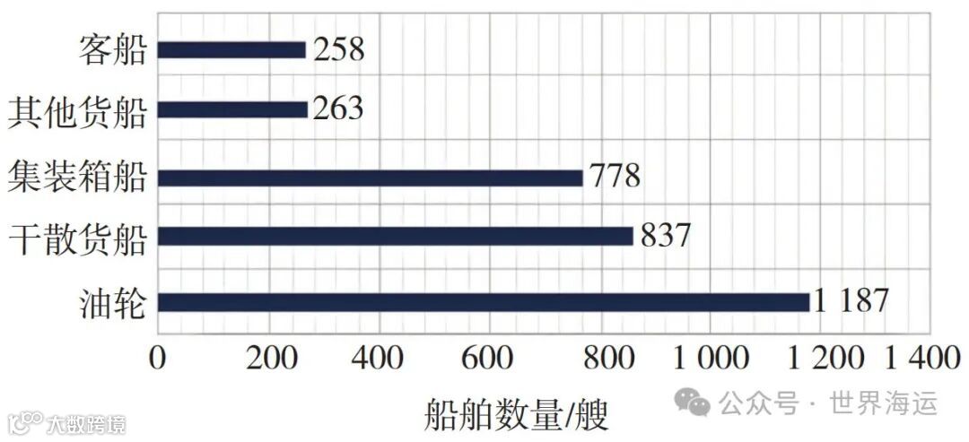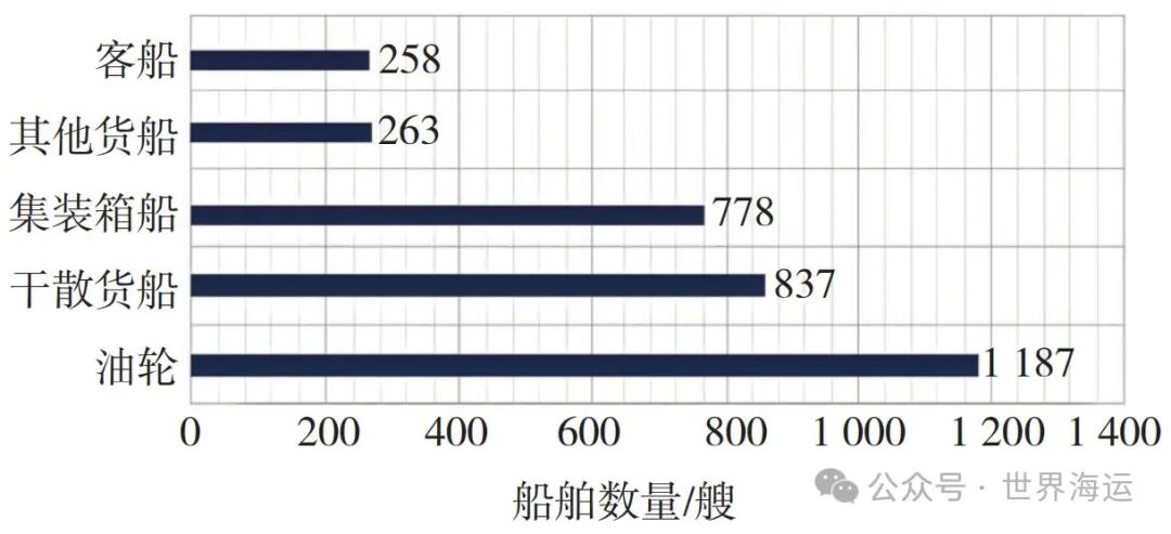 据美国船级社 ( ABS ) 统计,截至2024年3月,有发动机替代燃料改装需求的船舶有3 323艘,具体船型及数量详见图2。全球已完成和待改装的5 000总吨以上船舶总数达到92艘,相当于世界船舶总量的0.15%。其中,经过改装的船舶总数为49艘,总计180万总吨;待改装船舶总数为43艘,总计510万总吨[3]。
