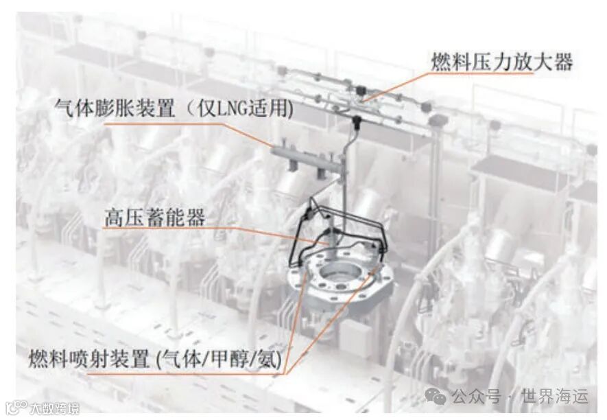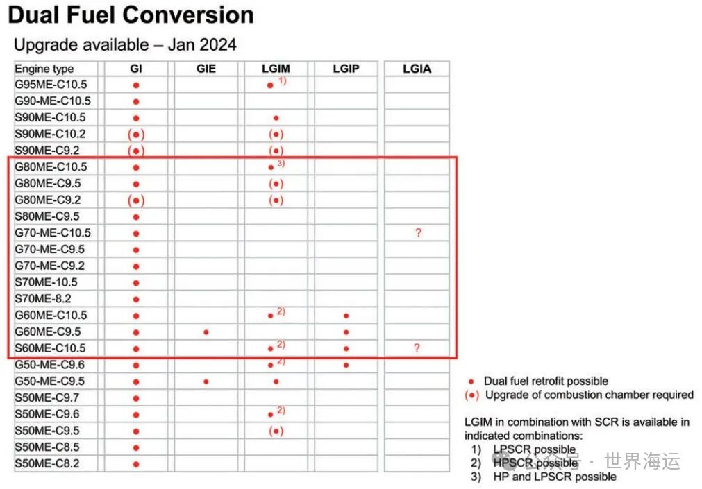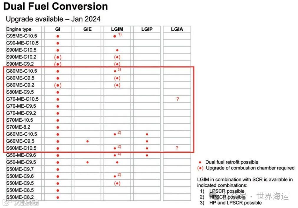 MAN ES研发了ME-LGIM型双燃料发动机,该发动机具备使用甲醇或传统燃料的能力,并且其运行原理遵循柴油机的工作机制。曼恩双燃料 ( 甲醇 ) 升级改装部分型号及转换系统详见图4。