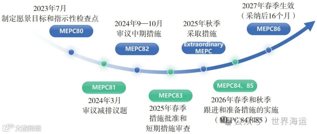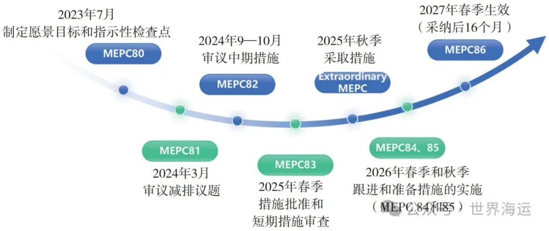 2023年,IMO在MEPC 80会议上设定了航运业净零排放愿景目标和指示性检查点,并制定短期、中期和长期的措施以促进减排目标的实现:至2030年,零排放或近零排放技术、燃料和/或能源在国际航运业总能耗中的比重应至少达到5%,并努力提升至10%;2050年左右达成温室气体净零排放的目标。2024年,IMO在MEPC 81会议上讨论了包括碳定价工具在内的减排措施,以帮助航运业实现2050年的温室气体净零排放目标。IMO在MEPC 82会议上讨论了减少船舶温室气体排放的中期措施,各成员国正在考虑提出一套具有强制约束力的温室气体减排中期措施,以期在2025年底通过。随着减排措施的生效实施和减排节点的临近,船用发动机低碳/零碳替代燃料改装需求愈加迫切。IMO的MEPC会议及中期措施计划时间表详见图3。