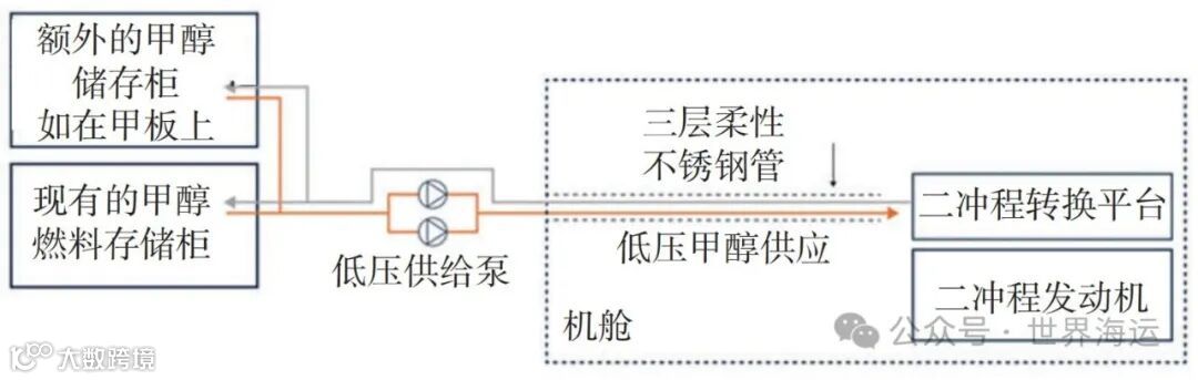 瓦锡兰研发的二冲程未来燃料转换平台采用了一种新的燃油喷射技术和燃烧概念,用于船舶的改装。瓦锡兰二冲程未来燃料 ( 甲醇 ) 改装平台及安装系统详见图5。改装平台设有两条燃料转换途径。其一,初始阶段可将燃料转化为LNG;其二,随着其他替代燃料的可用性逐渐提升,燃料可被用作混合燃料或完全替代燃料,从而减少实现净零排放所需的系统改装需求。如瓦锡兰二冲程柴油机甲醇燃料改装中,由于二冲程未来燃料转换技术融合了发动机上的燃料压力放大和控制,改装过程仅需配置低压燃料供应系统。使用的三层柔性不锈钢管包含甲醇供应、回流和真空绝缘功能,最大限度地提高了改装的灵活性,使在有限空间的装置中燃料转换成为可能[4]。