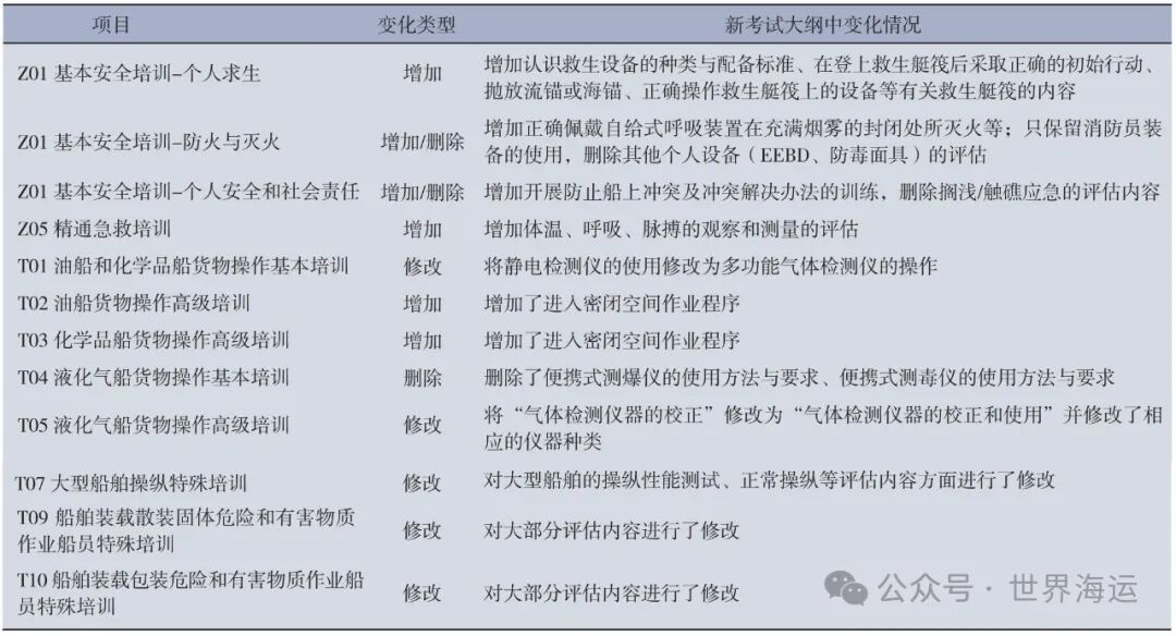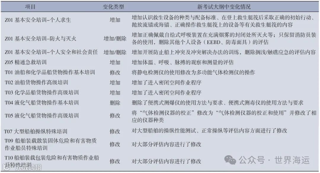 对比考试大纲和现行有效的合格证评估规范,发现两者有较多的不匹配的内容。其原因是考试大纲基于2021年发布的培训大纲和2019年发布的《海船船员培训合格证书签发管理办法》设置考试科目和考试内容,而合格证评估规范基于2012年的相关文件制定[2]。具体表现在: