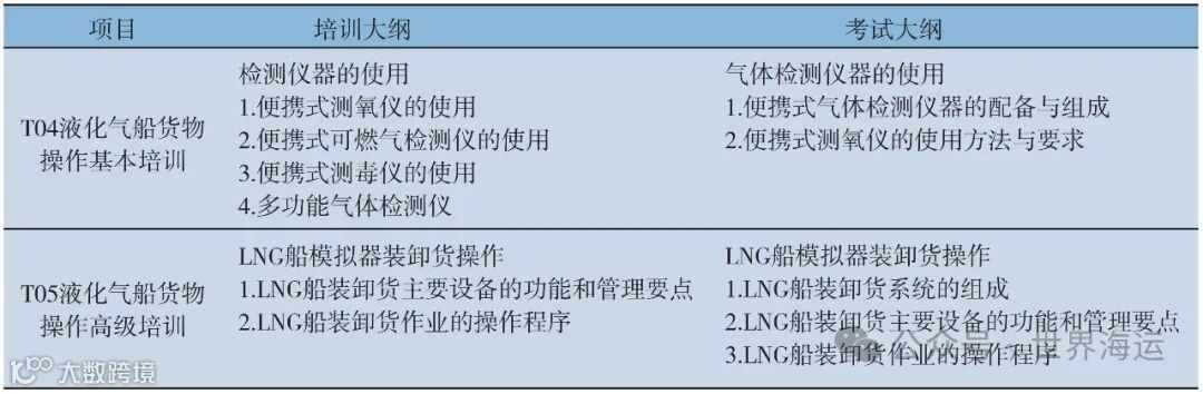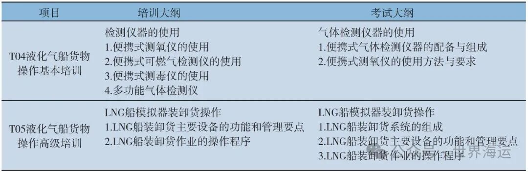 一是部分适任标准与STCW公约[1]对比有偏差,例如T11的考试大纲中,只有“LNG 储罐和燃料管系泄漏时应急反应”评估内容,没有考虑甲醇等其他低闪点燃料。针对公约中要求的《IGF规则》涉及的船舶燃料的范围,尤其是考虑到当前新造船舶中甲醇、氨等作为替代燃料的快速发展趋势,需要在适任标准中对新业态和新需求进行补充完善。二是培训大纲和考试大纲作为我国船员适任标准的重要文件,部分项目的适任要求不一致,见表1。T04和T05培训项目的考试大纲有部分要求内容超出培训大纲,给组织实施评估工作的考官和评估员带来一定程度的困惑,不利于评估工作的规范统一。