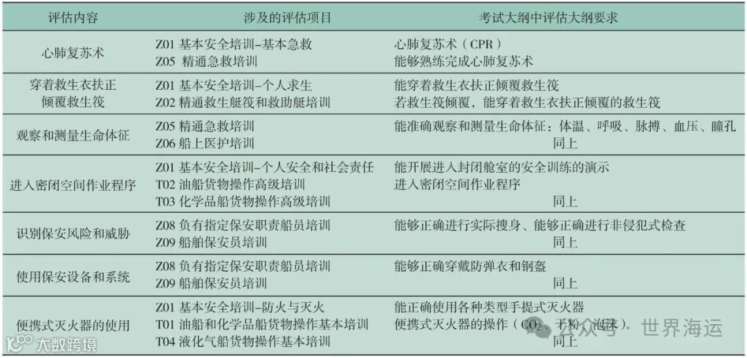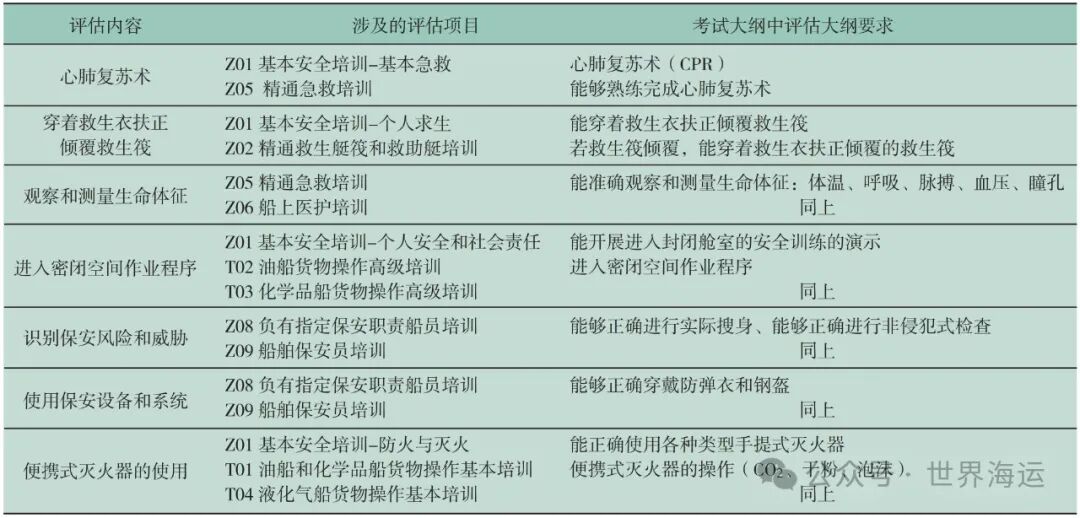 对于评估内容存在交叉重复的问题,建议分情况做出合理安排:一是对于基本培训中必须要求掌握的内容,如心肺复苏术、穿着救生衣扶正倾覆救生筏、便携式灭火器的使用等,若在其他高级培训项目再进行评估,则需要在评判标准上做出合理安排,以充分体现基本培训和高级培训之间的差别。二是对于同一评估内容,且评判标准要求也一样的适任要求,建议充分考虑已接受培训和考试的情况和结果,在新申请项目的评估中,合理利用已有经历和结果,优化“对表明适任能力的方法”的选择。例如:申请持有船上医护培训合格证 ( Z06 ) 的船员,需同时持有精通急救培训合格证 ( Z05 ),这两个项目中均有生命体征检查的评估内容,且评判标准相同;类似的,还有Z09和Z08评估中关于“识别保安风险和威胁”的内容,T02和T03评估中关于“进入密闭空间作业程序”的内容等。