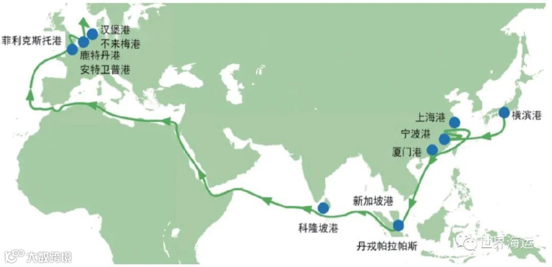 在东西方向贯通全球的主干航线有远东至北美航线、北美至欧洲地中海航线和远东至西北欧航线三条。其中,远东至西北欧航线总里程约11 000 n mile,运距最长,单向航程5~6周时间。在运营的集装箱船运力总规模达550万TEU,船舶数量超350艘。其中,17 000 TEU以上的超大型集装箱船占比超50%,12 000~16 999 TEU的大型集装箱船占比约35%,小型船占比较低[4]。该航线网络密布,挂靠港口众多,过境贸易高度发达,2022年亚洲—西北欧直航航线共计22条,亚洲—地中海直航航线共计17条。