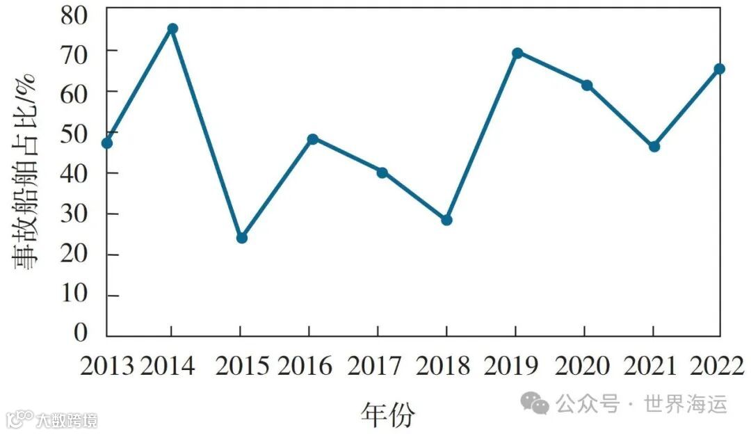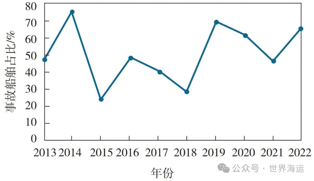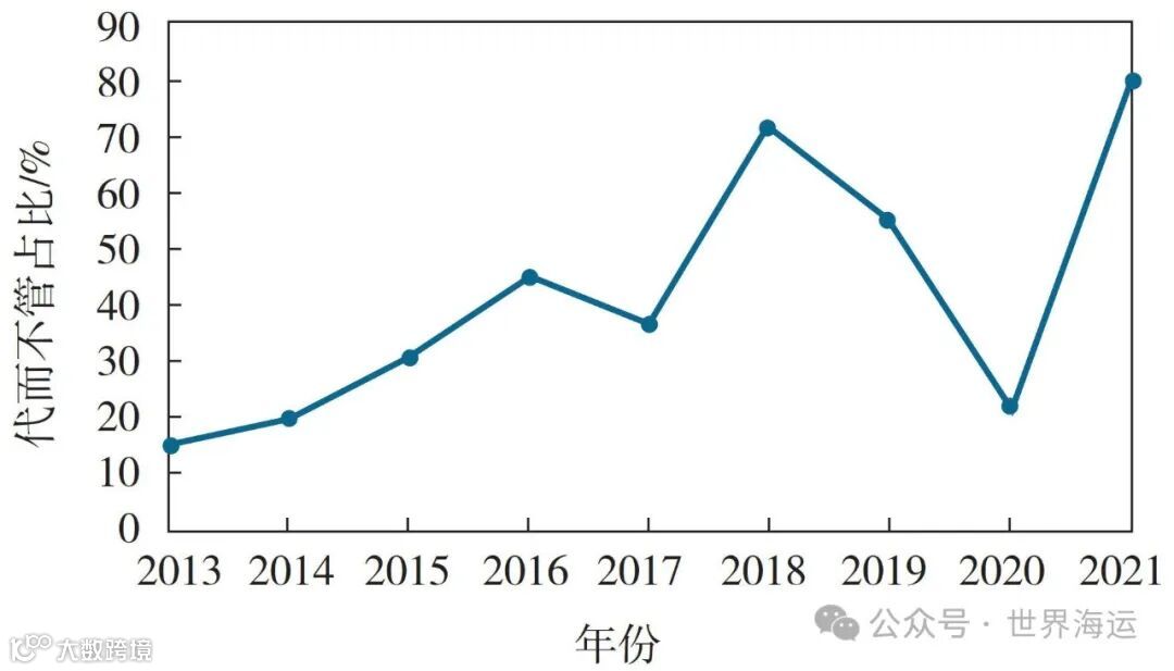 自沉事故中,船舶及其管理人适用《中华人民共和国船舶安全营运和防止污染管理规则 ( 试行 )》( 简称《安全管理规则》) 的事故的占比仅为25.78%,相对较小。不适用《安全管理规则》的则高达74.22%,主要是由于《安全管理规则》对体系内船舶的安全管理有明确的强制审核发证规定,适用《安全管理规则》的船舶称为“体系内船舶”。从图8可以看出,近些年体系内事故船舶存在“代而不管”现象 ( 船舶管理公司未实际履行安全与防污染管理职责 ) 的占比有一定上升趋势,尤其是自2018年以来,“代而不管”问题较为突出,2021年“代而不管”的自沉事故船舶占当年自沉事故船舶总量的比例更是达到了80%。