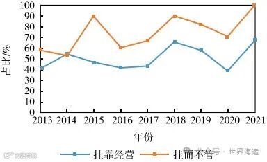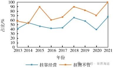 根据事故调查报告的内容,对事故船舶的经营状态和管理状态进行了统计分析,结果分别如图7、图8所示。根据图7所示的事故船舶经营状态的分布情况发现,在事故船舶营运过程中,挂靠经营现象较为多见,占当年事故船舶总量的50%左右。在所有挂靠经营的事故船舶中,“挂而不管”现象 ( 在挂靠经营模式下,船舶的经营管理仍由船舶实际控制人掌控 ) 较为突出,自2015年以来,“挂而不管”的事故船舶数量占当年挂靠经营事故船舶总量的百分比均在60%以上,最高在2021年达到了100%。究其原因是船舶挂靠在其他公司之下,船舶营运的相关工作却仍然由船舶实际控制人来完成,不利于对于船舶和船员的管理,船舶的水上运输风险随之显著升高。