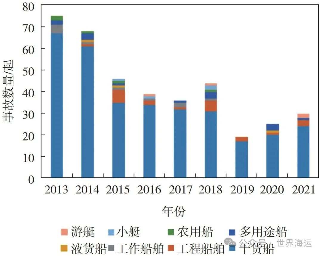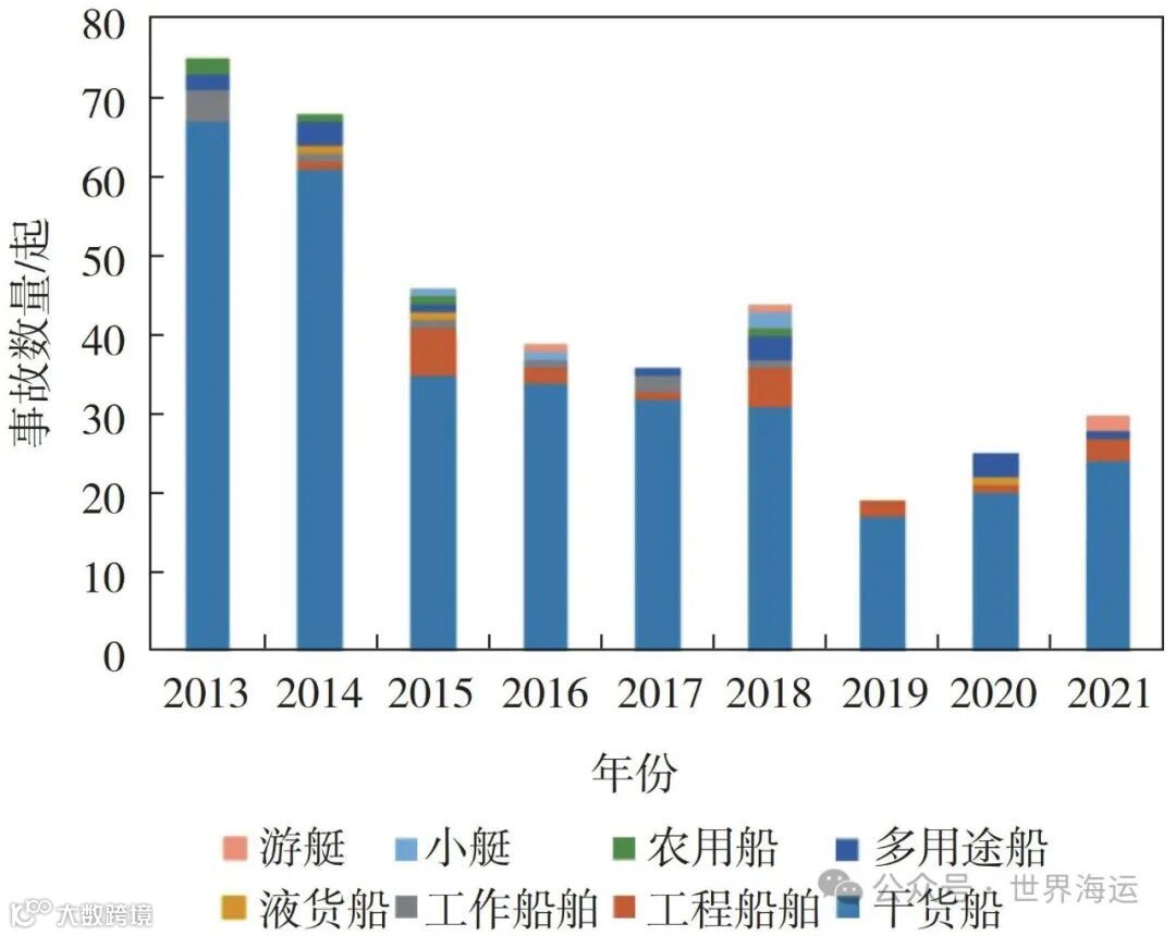 2013—2021年我国发生的船舶自沉事故的事故船舶类型分布如图5所示。可以看出,发生事故的船舶类型以干货船为主,且每一年干货船的事故数量占比均在70%以上。值得注意的是,自2014年以来,工程船舶自沉事故每年均有发生,占当年自沉事故总量的10%左右,究其原因可能是近些年我国沿海水域的水上、水下施工活动较多。其余类型的船舶发生事故数量在每年的分布较为平均,且占比较小。