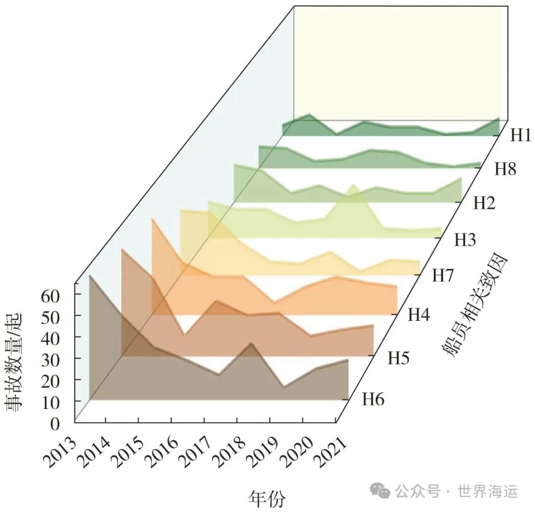 2013—2021年我国发生自沉事故船舶的船员配员相关问题及船员致因分布情况如图11、12所示。根据图11可以发现,自2019年以来,自沉事故船舶的船员配员问题相对比较突出。船员配员相关问题主要包括配员不足 ( 未满足最低配员要求 ) 和船员不适任 ( 船员适任证书存在问题 )。船舶配员不足很容易导致船员休息时间不足、工作压力增大、漠视相关安全管理规则,给船舶安全带来极大隐患;不适任的船员不具备相应的知识和技能,不能胜任在船工作,无法确保船舶安全航行及处置危险状况,内河船员非法涉海运输便是其中的典型情况。为进一步分析船舶自沉事故中的人为致因,根据事故调查报告,对船员相关事故致因进行了统计分析,如图12所示,出现频次较多的人为事故致因分别是:故意/习惯性违规操作 ( H1 )、船员知识能力受限 ( H2 )、船员技能受限 ( H3 )、违反作业程序 ( H4 )、应急决策失误/应急组织不当 ( H5 )、对当前航行风险认识不足 ( H6 )、未及时发现并排除隐患 ( H7 )、值班疏忽 ( H8 )。