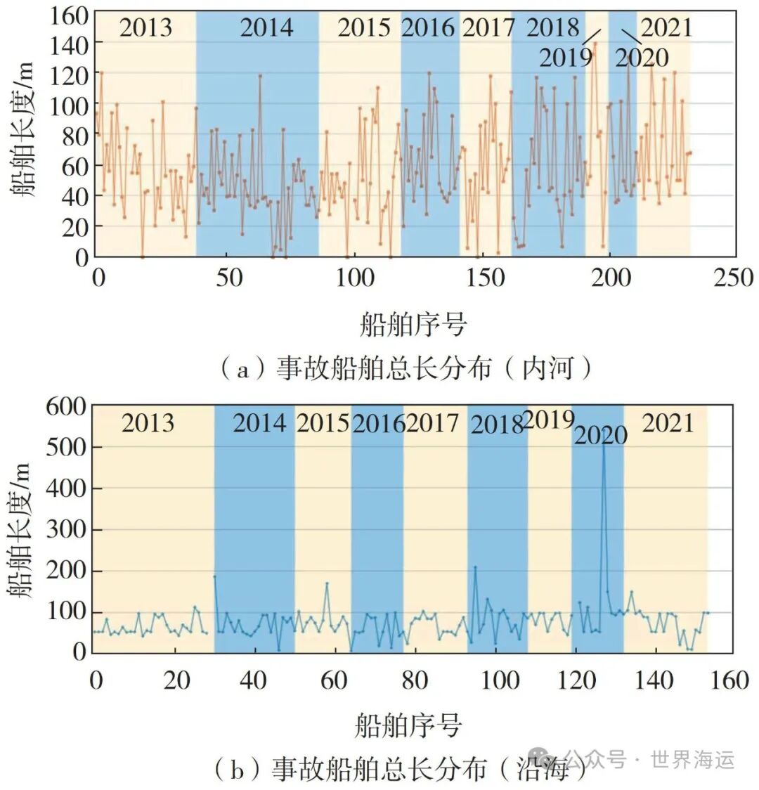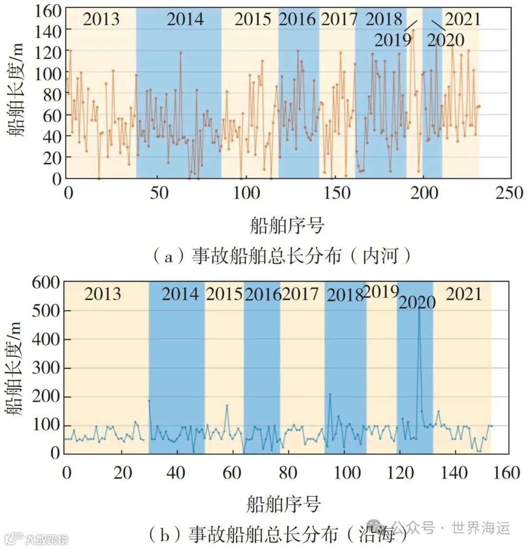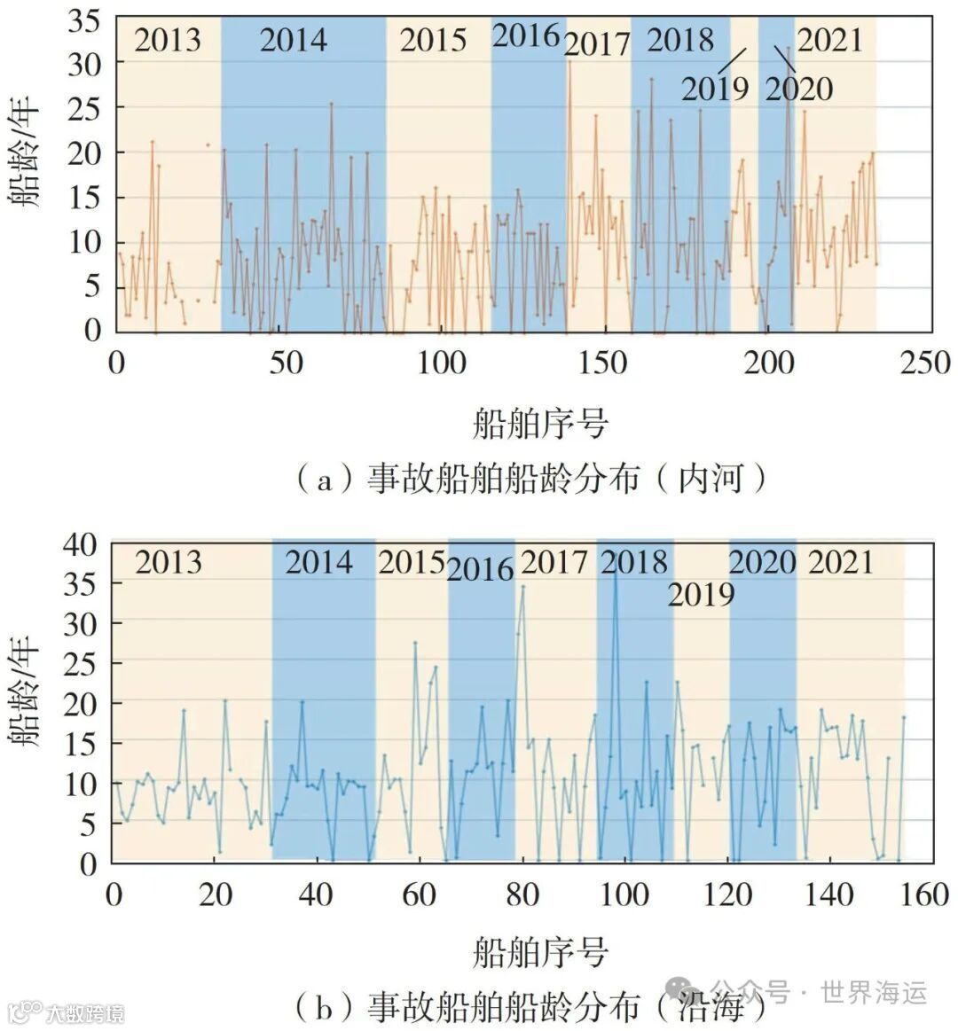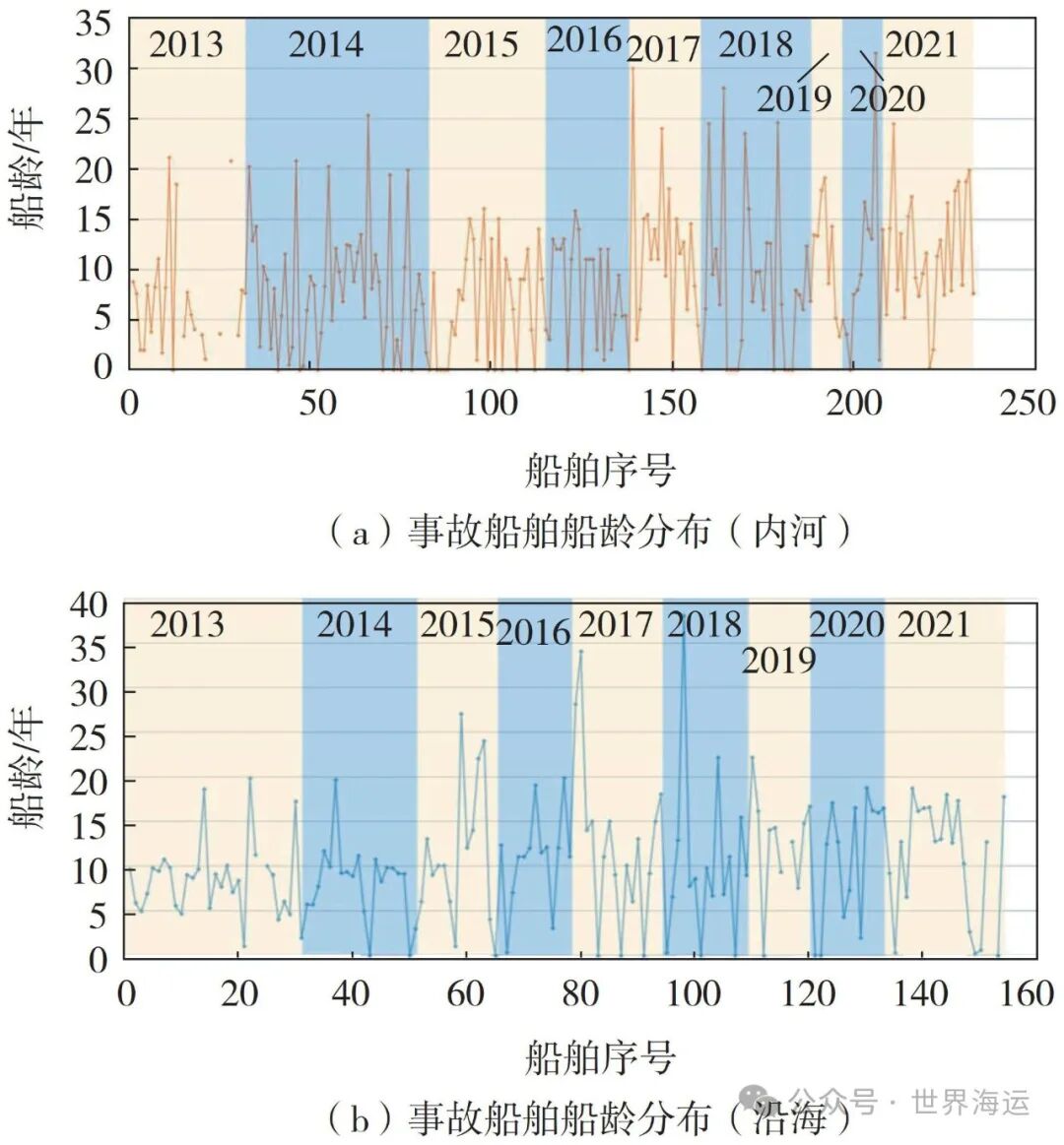 事故船舶的船舶总长分布如图9所示。图9 ( a ) 为内河事故船舶情况,整体来看,随着时间的推移,尤其是自2015年以来,事故船舶的船舶总长呈现出波动上升的趋势,由不足100 m到逐渐接近甚至是超过100 m;图9 ( b ) 为沿海事故船舶情况,可以看出沿海事故船舶的船舶总长并未呈现出逐年上升的趋势,大多数事故船舶的船舶总长在100 m以下。事故船舶的船龄分布如图10所示,可以看出内河和沿海事故船舶的船龄主要分布在5~20年区间内,其中内河船舶船龄在此区间的占比接近65%,沿海船舶船龄在此区间的占比超过74%。这说明船龄在5年以上的船舶可能由于设备老化、保养不良等因素造成安全系数下降,更容易发生自沉事故。