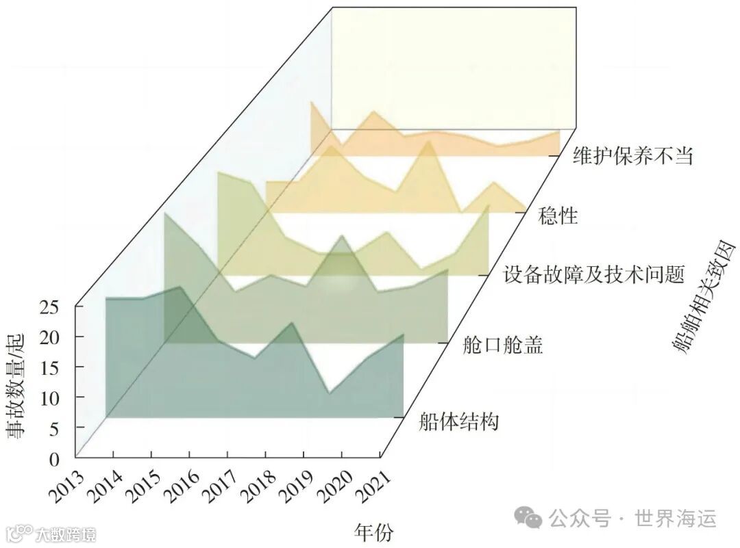 2013—2021年中国水域船舶自沉事故致因中,与船舶本身相关的致因分布情况如图15所示。根据事故调查报告的描述,出现频次相对较高的船舶相关事故致因包括:船体结构原因 ( 表现为船体强度不够、船体破损等 )、舱口舱盖原因、设备故障及技术问题、船舶稳性及船舶维护保养不当。从出现频次上看,船体结构与舱口舱盖相关的致因最为常见,会直接导致船舶/货舱进水,继而引发船舶沉没;从时间分布上看,船体结构问题和舱口舱盖问题均没有明显的改善迹象,事故数量甚至出现上升趋势。