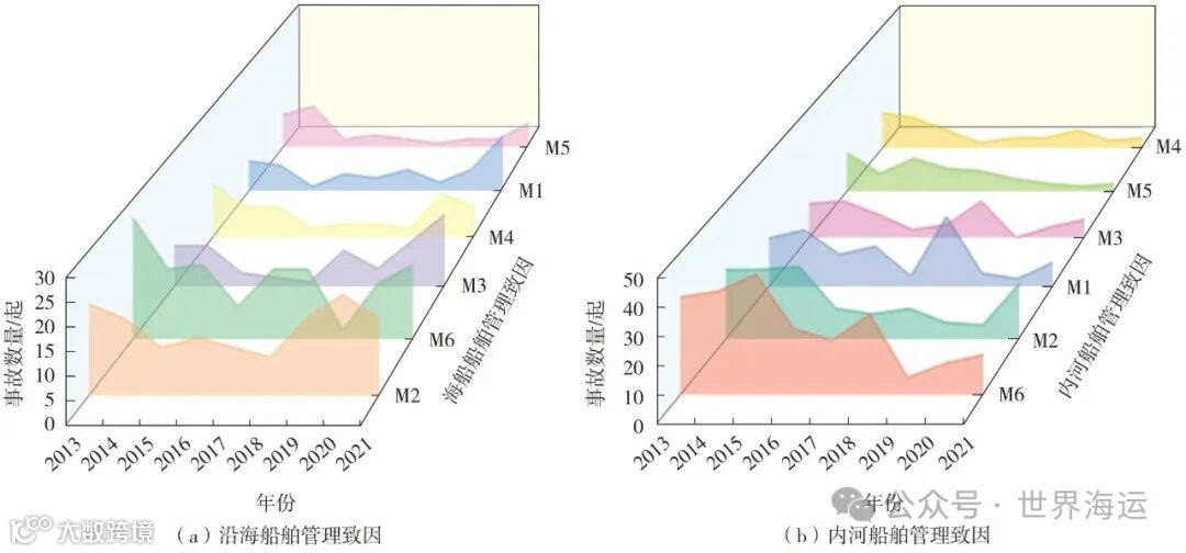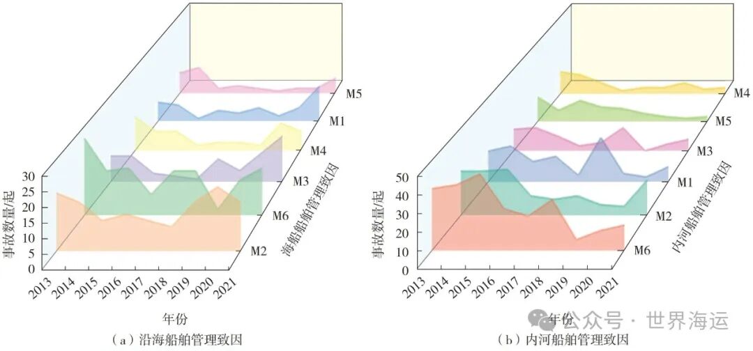 2013—2021年中国水域船舶自沉事故的船舶管理相关致因的分布情况如图13、14所示。根据事故调查报告的描述,出现频次相对较高的管理相关事故致因包括:航运公司非法营运 ( M1 )、在航船舶无法获取有效的岸基支持 ( M2 )、公司未及时跟踪掌握船舶动态 ( M3 )、规章制度体系不健全/未落实 ( M4 )、船舶营运资质不满足要求 ( M5 )、船员管理存在问题 ( M6 )。图13 ( a ) 所示为沿海事故船舶管理相关致因的统计结果,图13 ( b ) 为内河事故船舶管理相关致因的统计结果。通过对比图13 ( a ) 和图13 ( b ),可以发现沿海船舶与内河船舶在管理相关致因方面存在一定的差异,前者出现频次最高的管理致因是在航船舶无法获取有效的岸基支持 ( M2 ),而后者出现频次最高的则是船员管理存在问题 ( M6 );航运公司非法营运问题在内河船舶运输领域更为突出,主要表现为内河船舶非法涉海运输,但是从逐年分布来看,这一现象近些年得到了较大程度的遏制。由图14可以看出,近些年船舶管理相关事故致因呈现先减少后增加的趋势。