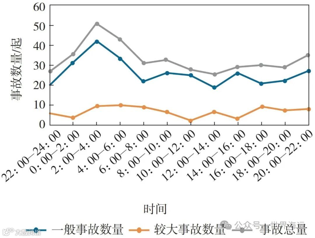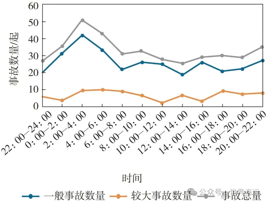 船舶自沉事故按发生时间统计情况如图2所示。整体来看,从22:00到次日凌晨6:00为船舶自沉事故的高发时间段,尤其是在凌晨2:00—4:00,一般事故等级及以上事故的数量均达到最高;6:00—22:00期间,事故发生数量相对较低且波动不大。究其原因可能是凌晨2:00—4:00是人最为疲劳和容易疏忽的时段,经历了一天工作的船员更是如此,在这一时段船员疏于职守、疲劳值班等问题多发易发,进而导致事故的发生。