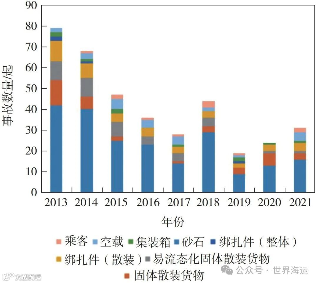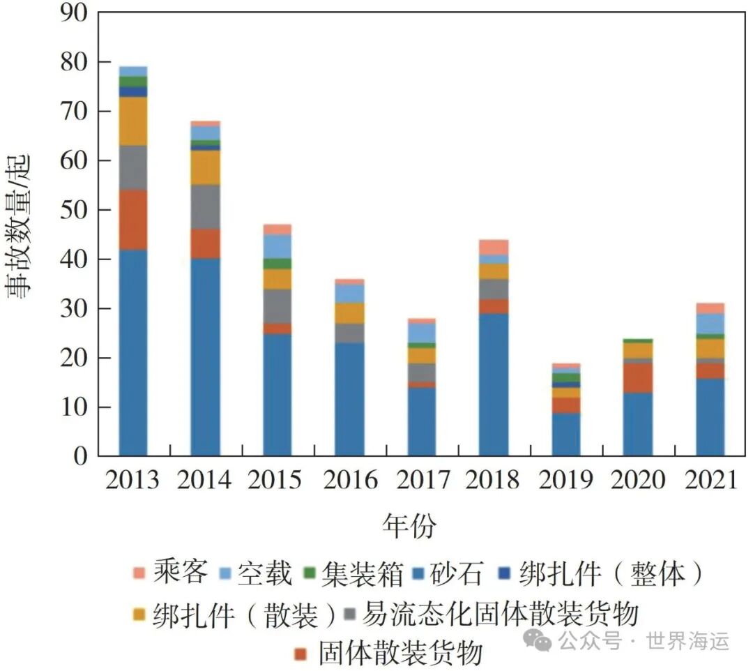 2013—2021年中国水域船舶自沉事故致因中,与船舶载货相关的致因分布情况如图16所示。根据事故调查报告的描述,出现频次相对较高的货物相关事故致因包括:货物系固/平舱问题、船舶超载、航行过程中货物移位及货物不适装。其中,货物系固/平舱问题在货物相关致因中出现频次最高,尽管呈现出了一定的波动下降趋势,但是近些年仍然处于高位波动态势;值得注意的是,船舶超载问题近些年得到了有效遏制,下降趋势明显;货物不适装问题主要出现在易流态化固体散装货物运输中,交通运输部及海事主管机关先后发布了多项与船载易流态化固体散装货物安全管理相关规定,对其不适装问题的管控效果明显。