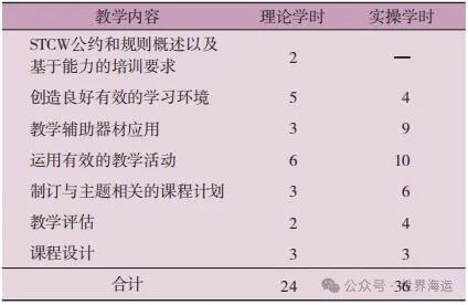 IMO教员培训示范课程 ( 6.09 ) 是专门针对教员培训的标准课程,该课程目标介绍中明确:该课程给予教学经验有限的船员培训教员一种教学技巧和方法方面的指导和服务,以帮助教员使用适当的方法和教具有效地开展基于能力的船员课程教学。在示范课程中,明确教员培训班的规模最大为20人一个班,培训班需由两名具有航运相关专业背景和海事教育培训经历的人员担任教员。示范课程设置了较长时间的培训课程,且注重实操教学的安排 ( 实操学时占60% ),培训课程突出对教学活动的准备、实施等过程的指导,也对教员开展教学评估的目的、方法和结果运用进行了指导[5]。该示范课程的教学内容和安排见表2。