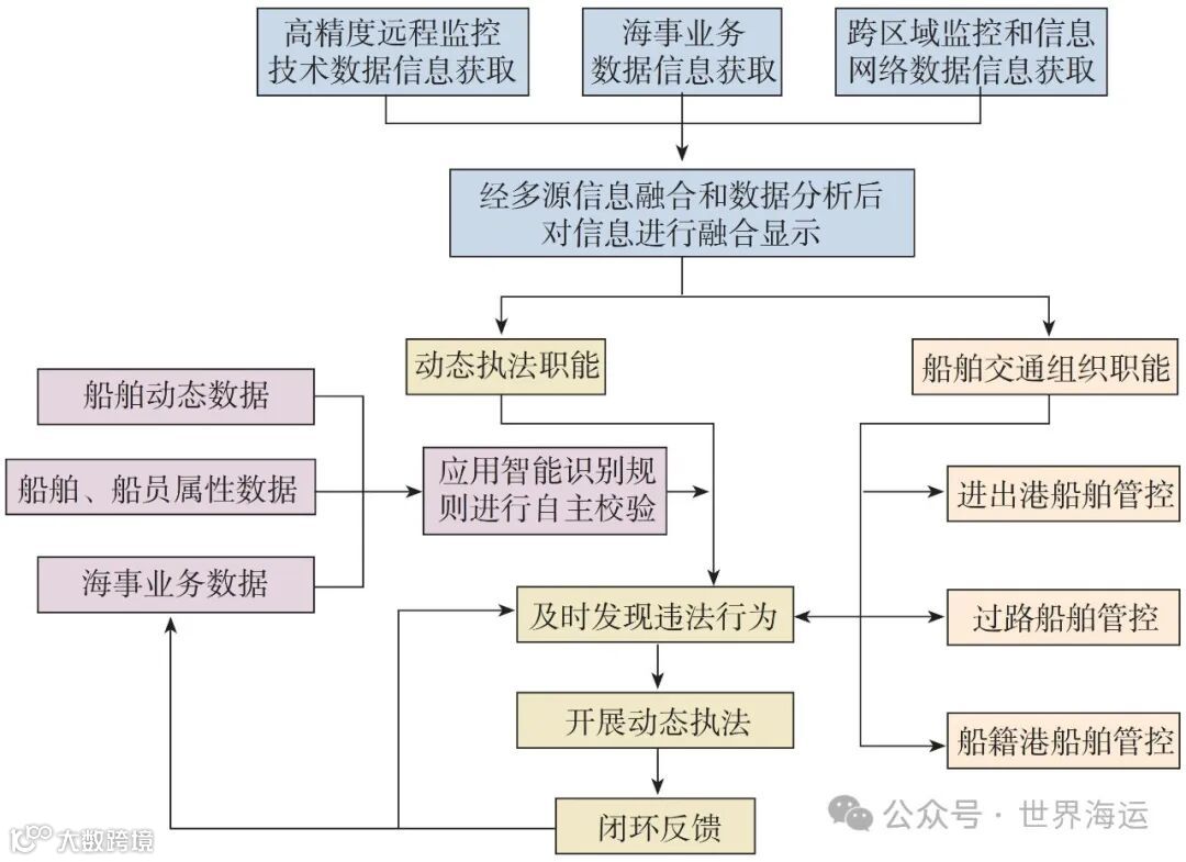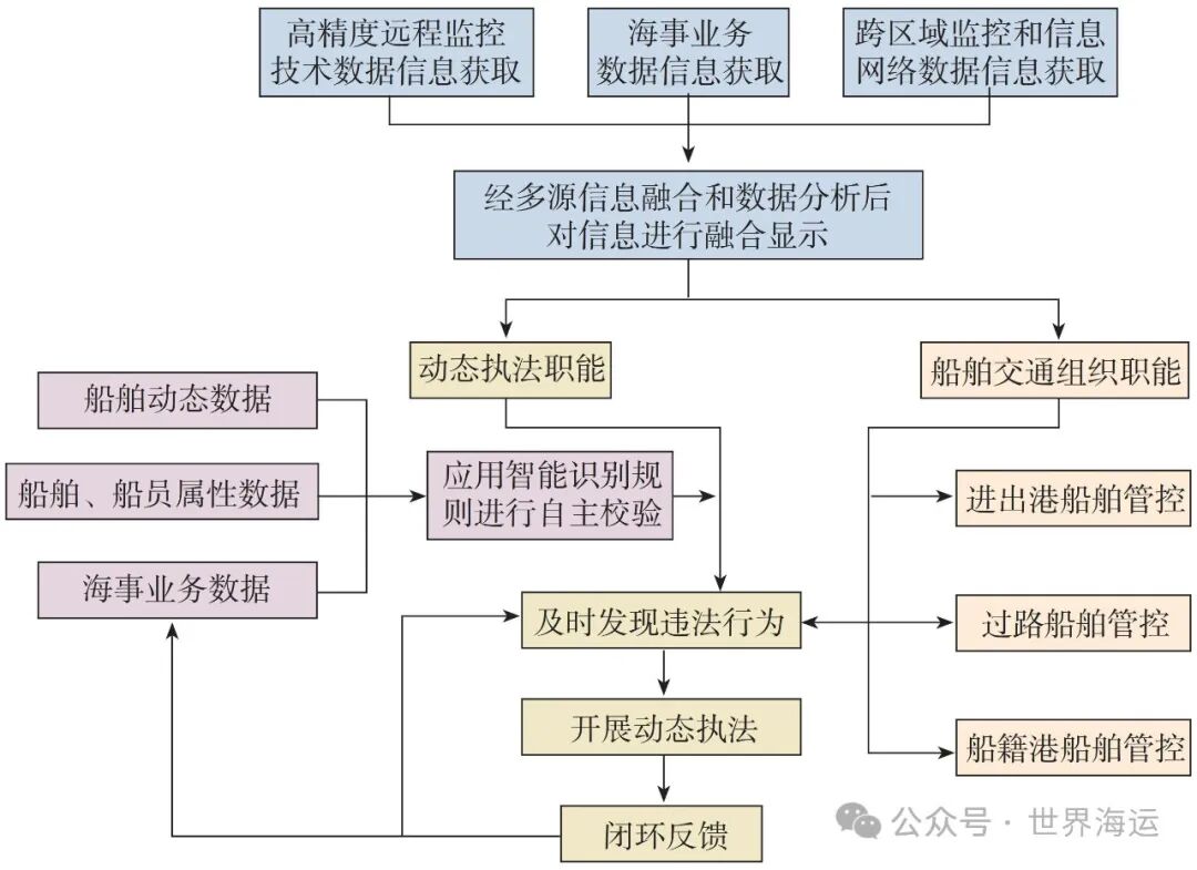 立足强化VTS动态执法职能,推动海上动态感知能力提升,有助于快速推进全要素水上“大交管”建设[9]。一是推进全要素管理,强化“人、船、货、环境、管理”等要素汇聚融合,实现海事管理由“条块分割”向“全要素管理”转变。二是提升全业务协同,打通通航、船舶、船员、危防、公司管理等跨部门业务,统筹执法资源配置,实现高效执法。三是增强全覆盖能力,持续强化海上动态感知能力建设,实现“船舶航行到哪里海事服务就跟进到哪里”,有效行使海事事权,维护国家海权。