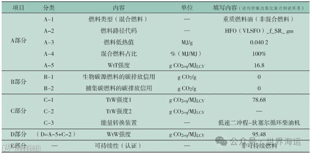 LCA导则中还提供了用于收集和传递船用燃料生命周期评价信息的燃料生命周期标签 ( 英文缩写为“FLL”)。FLL分为五部分 ( 参见表1 ):A部分填写燃料自身的相关信息;B部分填写燃料碳信用的相关信息;C部分填写船上相关信息,包括下游排放强度及能量转换装置类型 ( 现指发动机类型 );D部分填写燃料全生命周期排放强度;E部分填写燃料经认证的可持续性评价结果信息。需要特别说明的是,FLL并不是燃料供应商能够独自完成的,下游排放中所涉及的能量转换装置形式及下游排放强度计算公式中的CH4、N2O和船上捕集碳等都不是燃料供应商所能提供的,所以这个标签将来很有可能需要几方共同填写完成,或者FLL需要拆分成几个模块分别填写。