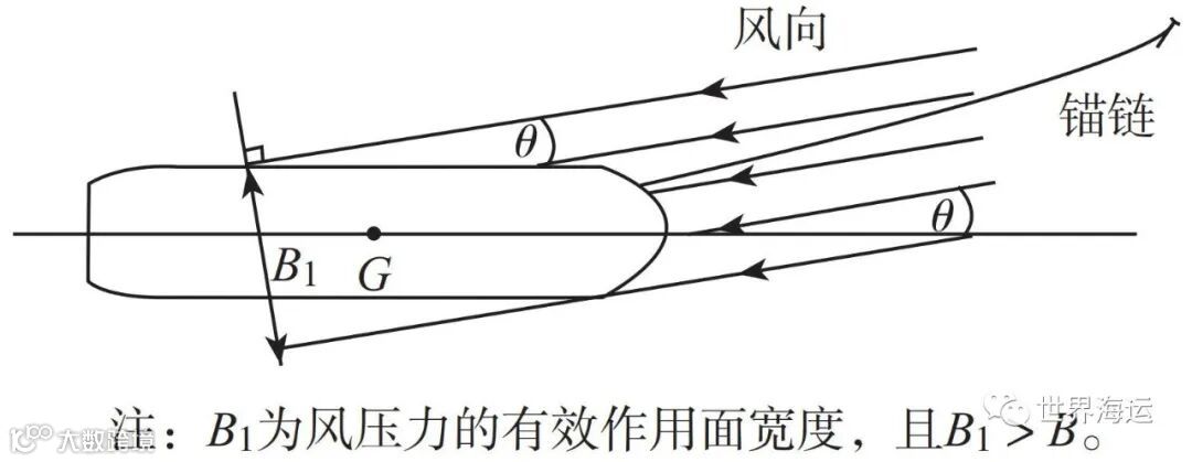 ③当船舶在强风中单锚泊且船体处于平衡状态时,由于锚链拉力的作用点偏离船舶中线面,船首向与风向形成的风舷角θ 通常小于6° ( 见图1 )。因此不妨把Asin6° ( 0.1A ) 视为风压力用于船舶满载水线以上船体侧面的有效投影面积,实际上0.1A的值是夏季满载水线以上船体和上层建筑正投影面积的特征值即2B·h值的补充部分,其值占N 的权重比较小,占3%~4%。换言之,(2B ·h+0.1A)的值体现的是船舶满载水线以上迎风面积的特征值。