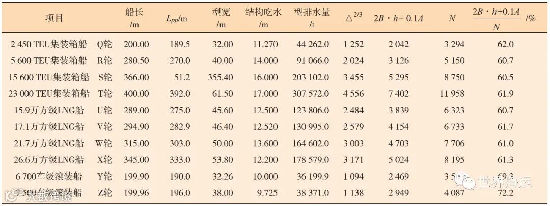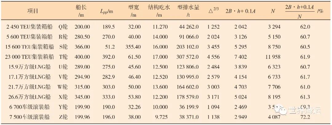 所谓大、中型高干舷船,在此特指船长接近或超过200 m的集装箱船、LNG船、滚装船。和散装船相比,这三类船舶均具有满载吃水小、干舷高度高、方形系数小的特点。