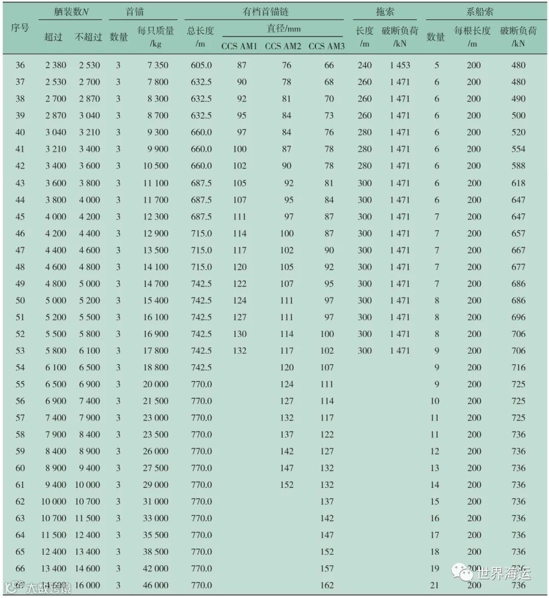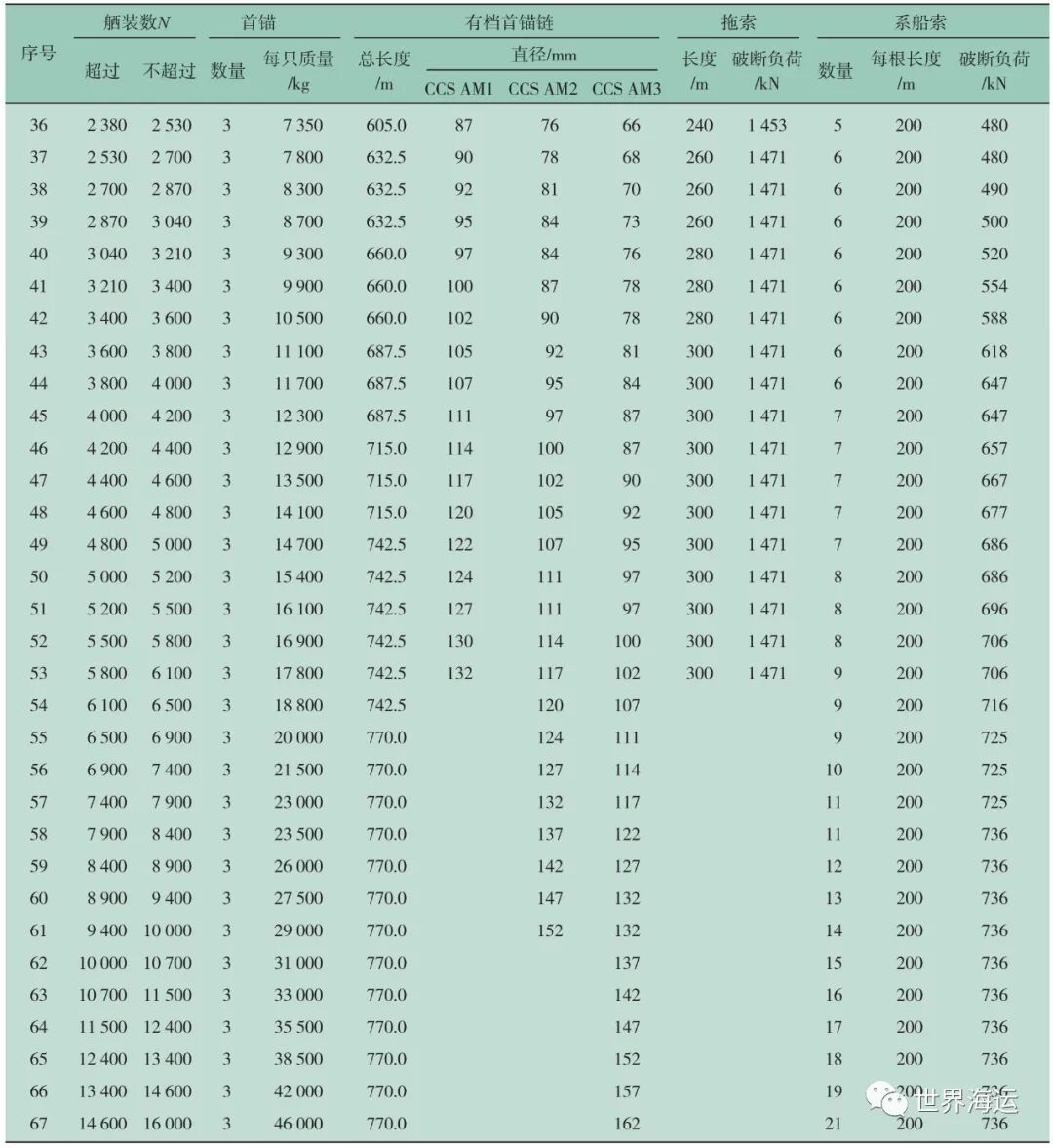 ①船舶舾装数从小到大被依序划分为67个数据段,并对应67个船舶舾装等级。这样做既有利于统一锚和锚链的制造标准,又便于各船级社对拟入级船舶锚设备进行检验。