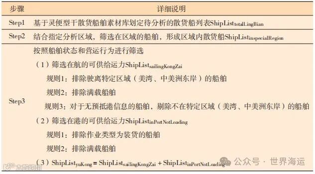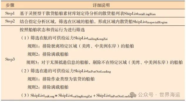 本文提出的可供给船舶运力分析模型综合考虑船舶基本信息、AIS船位信息、基于航运大数据分析的船舶状态及营运行为等信息,采用三层结构进行指定时点的可供给运力分析追踪:( 1 ) 利用灵便型干散货船舶素材库划定待分析的散货船范围。( 2 ) 结合分析的指定区域范围 ( 如美湾、中美洲东岸 ),利用AIS船位信息粗筛区域内船舶。( 3 ) 基于航运大数据分析的船舶状态和营运行为,设计可供给船舶运力分析模型,按照船舶在航和船舶在港进行区分,考虑预抵港口、空/满载、在港装/卸货等维度信息。下面给出具体执行过程说明 ( 如表2所示 )。