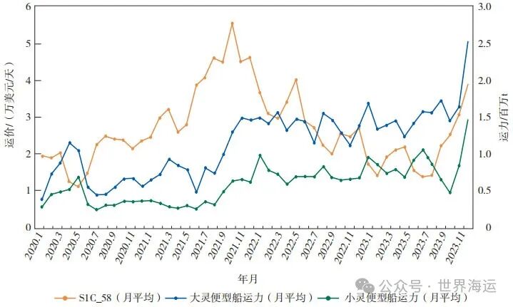 在运力供给方面,根据运力可供给模型识别的船舶清单统计市场干散货船的运力供给量 ( 按照载重吨进行加和计算,单位为百万t )。选取了2020年1月到2023年12月的时间段,对S1C_58运价指数和大灵便型船运力、小灵便型船运力进行数据收集分析,采用月度平均方式进行数据处理 ( 如图7所示 )。从中可以观察到:( 1 ) 运力的快速上涨滞后于运价的快速上涨。4年时间内,运价指数经历了2次长时间的快速上涨,一次发生在2021年4月至2021年10月,运价指数从26 000上涨至55 000。大灵便型船运力在2021年11月达到高峰,小灵便型船运力在2022年1月上涨至峰值。如果考虑到S1C_58指数运价统计的是3~10天前的成交价格,大灵便型船运力的滞后时间约为1.5个月、小灵便型船运力的滞后时间约为3.5个月。( 2 ) 长期运力供给充足,会进一步压低运价水平。相较于2020年7月至2021年7月的80万t运力供给,自2021年11月大灵便型船运力上涨至阶段峰值后,运力供给长期维持在150万t的水平,进一步迫使运价从2021年10月的高位持续走低。