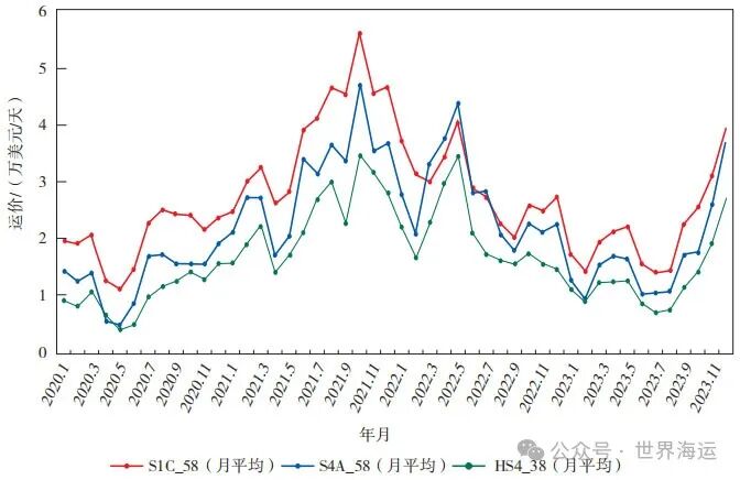 干散货船舶租金运价水平主要通过相关运价指数反映,采用月度平均的方式对S1C_58、S4A_58、HS4_38进行均值处理(如图6所示)。可以看出,2020—2023年三条运价指数在较大区间波动:S1C_58运价指数最大值为55 514、最小值为11 211;S4A_58运价指数最大值为46 749、最小值为4 756;HS4_38运价指数最大值为34 350、最小值为4 107。表3统计了三条运价指数之间的相关性,相关性系数越接近1,代表越相关。可以发现三条指数高度相关,其中S4A_58与HS4_38的相关系数高达0.970 7,反映出大灵便型船运价指数与小灵便型船运价指数有较强的正相关性,这一定程度上说明美湾地区的灵便型船运价指数走势内部呈现高度关联性。