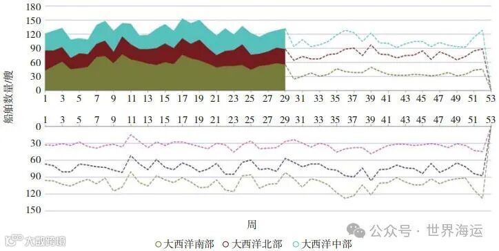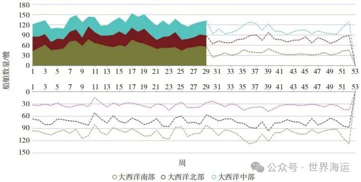 航运大数据整合汇聚了多维度基础数据信息,包括船舶档案、港口与泊位数据、AIS船位数据。在此基础上,利用大数据分析与处理技术,通过数据清洗、加工整合生成中间层计算数据,包括船舶航行事件、历史航段数据等。对于船舶航行事件的分析,支持按照航行、靠泊、锚泊、搁浅等状态进行细化查询。结合船舶挂靠泊位、吃水变化,分析识别出船舶装货、卸货、加油、修船等营运行为。按照选中的船位分布区域 ( 美湾、中美洲东岸 ) 对历史上的大灵便型散货船进行统计分析 ( 如图4所示 ),其中实线部分代表2024年每周二船位分布变化,虚线是根据历史经验预测未来与一段时间船位数量分布变化。