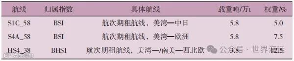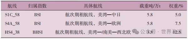 BSI ( 波罗的海超灵便型干散货船运价指数 ) 和BHSI ( 小灵便型干散货船运价指数 ) 是波罗的海干散货船运价指数的重要组成部分。其中,BSI包括10条典型航线,反映超级大灵便型船的市场租金水平;BHSI包含7条典型航线,是反映小灵便型散货船航运市场好坏的晴雨表。本文结合分析的美湾区域,选取了三条典型期租航线:S1C_58、S4A_58、HS4_38,如表1所示。