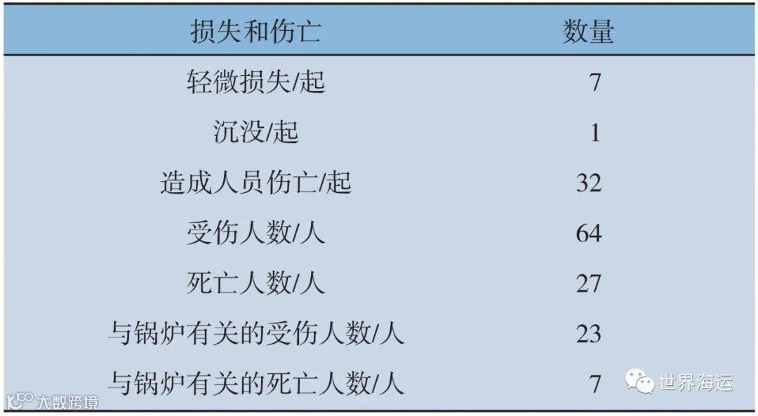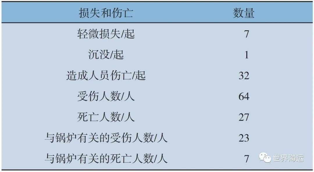 本文的轻微损失是指机舱火灾未造成机电设备功能性损坏或人员伤亡,只有7次,说明机舱火灾对机电设备和人身安全造成损害概率很大。在32起造成人员伤亡的火灾中,总计伤亡人数为91人,平均每起大约受伤2人,死亡1人。船舶锅炉造成伤亡的人数最多,主要为锅炉燃烧和爆炸所致。