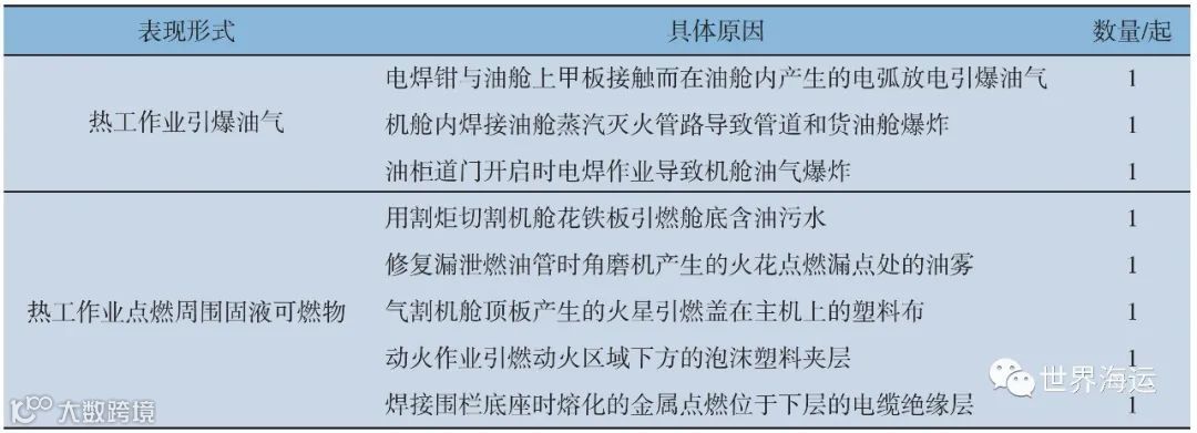 在100起机舱火灾事故中,由于违规热工作业引起的共计8起,其表现形式包括:①热工作业引爆油气,共计3起;②热工作业点燃周围固液可燃物,共计5起。违规热工作业引起火灾具体情况见表5。