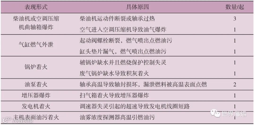 机械设备故障引发的机舱火灾事故共计13起。本文中引起机舱火灾的机械设备故障主要包括曲轴箱爆炸、增压器爆炸、气缸燃气外泄、锅炉干烧、发电机线圈短路、油泵轴承高温等。曲轴箱爆炸导致机舱火灾共计4起,涉及的设备有柴油机和空调压缩机两种,其中柴油机曲轴箱爆炸火灾事故3起,空调压缩机曲轴箱爆炸火灾事故1起。柴油机曲轴箱爆炸的原因主要为运动件 ( 活塞、连杆、连杆螺栓 ) 断裂和轴承过热,运动件断裂会击碎曲轴箱,造成油气外泄,油气被激烈碰撞产生的能量引燃,轴承过热会引起曲轴箱内油气浓度过高,高温轴承表面点燃油气造成爆炸。空调压缩机曲轴箱爆炸的原因为空气进入曲轴箱 ( 低压继电器失灵 ),机体温度升高造成曲轴箱内油气爆炸。气缸燃气外泄造成火灾事故2起,原因分别为起动阀螺栓断裂和气缸盖垫片漏气。锅炉干烧造成机舱火灾事故2起,其中因燃油辅锅炉和废气锅炉缺水各1起。油泵轴承高温造成火灾2起,轴承高温导致机械轴封损坏,燃料漏泄并被轴承点燃。其他原因导致机舱火灾各1起。由机械设备故障引起机舱火灾具体情况见表2。