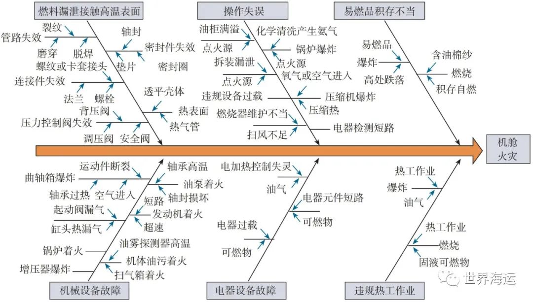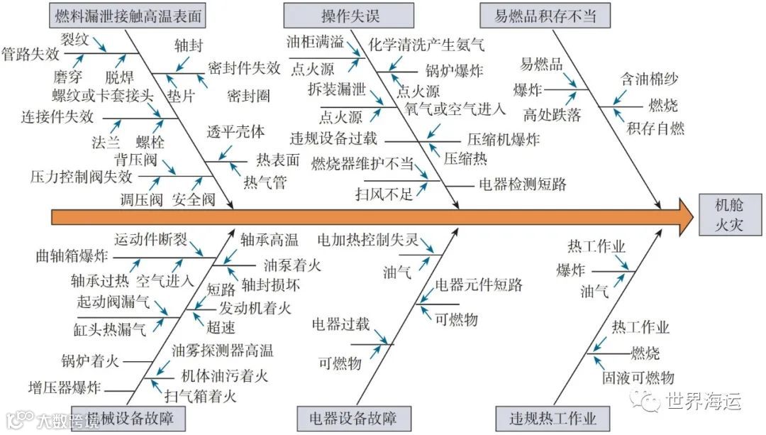 鱼骨图又名石川图,是一种探究问题原因常用的方法,具有简洁实用、深入直观的特点。图1为基于因果分析法进行因果关联而绘制的机舱火灾原因的鱼骨图。