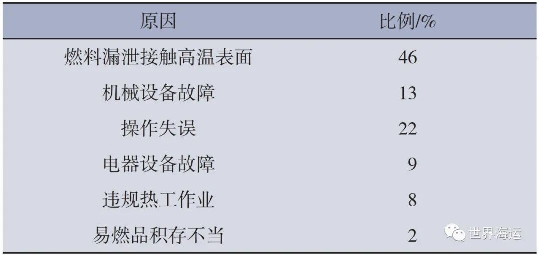 此类机舱火灾共2起,原因分别为罐装易燃品高处跌落和工作间积存的含油棉纱自燃。各种原因引起机舱火灾的比例见表6。