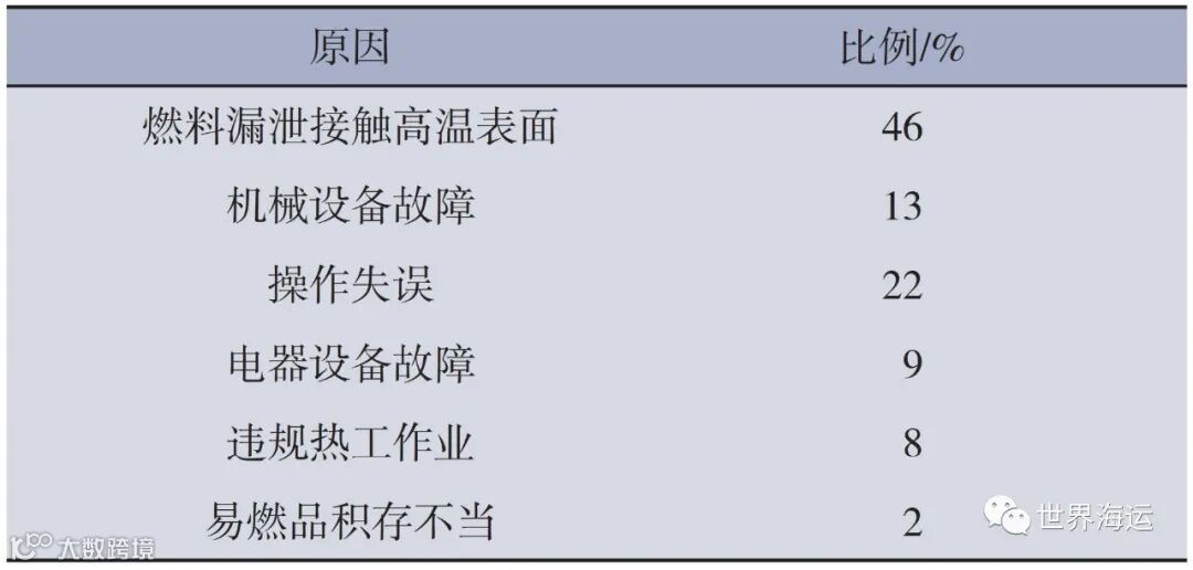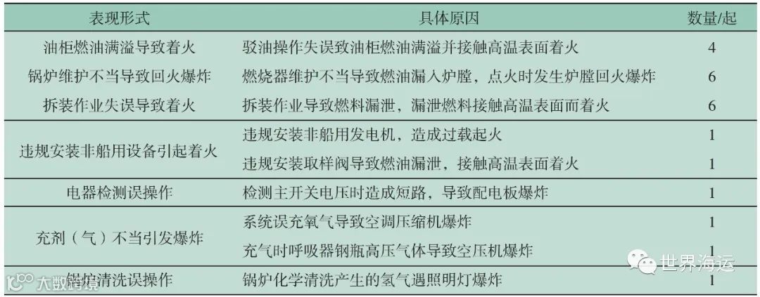 本文共研究了100起船舶机舱火灾实际事故案例,全部来源于官方公布的资料,绝大部分数据来源于英国海上事故调查局 ( MAIB )、ATSB、日本交通安全局 ( JTSB )、香港海事处和中国海事局的事故案例调查报告,较少部分事故案例数据来源于科技论文。