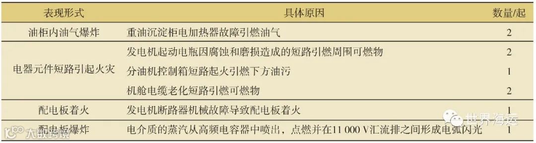 电器设备故障引起机舱火灾共计9起,其表现形式包括:①电加热器控制失灵引燃油气,共计2起;②电器元件短路引燃可燃物,共计5起;③电器元件过载引燃可燃物,共计2起。电器设备故障引起火灾具体情况见表4。