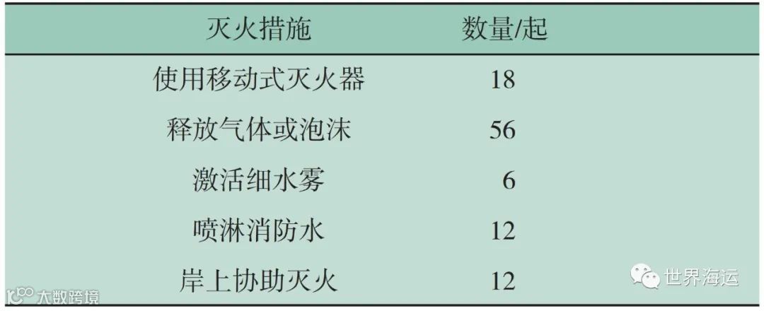 发生机舱火灾时,采取的灭火措施主要包括使用移动式灭火器、释放气体或泡沫灭火系统、激活细水雾灭火系统、喷淋消防水和岸上协助灭火等。统计案例中采取的灭火措施情况见表9。