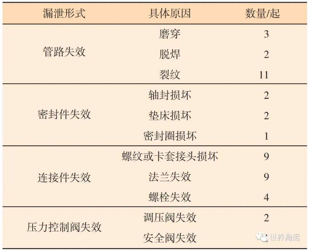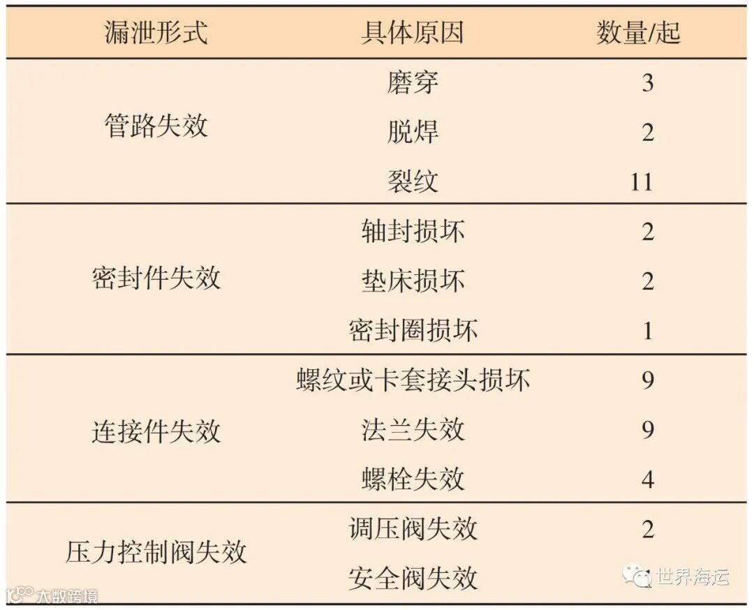 燃料漏泄接触高温表面引发的机舱火灾事故共计46起,其中主机燃料漏泄火灾19起,副机燃料漏泄火灾13起,导热油锅炉燃料漏泄火灾7起,液压油漏泄火灾6起,油柜漏泄火灾1起。燃料漏泄主要以压力喷溅和高处滴落两种形式接触高温表面,其中压力喷溅占大多数,共计32起。燃料漏泄主要来源于机舱燃油、滑油、液压油动力管系,其主要原因可分为管路失效、连接件失效、密封件失效和压力控制阀件失效,46起事故中各种燃料漏泄形式及原因的统计见表1。高温表面是漏泄燃料的点火源,主要是指柴油机排气管和增压器的裸露高温表面。