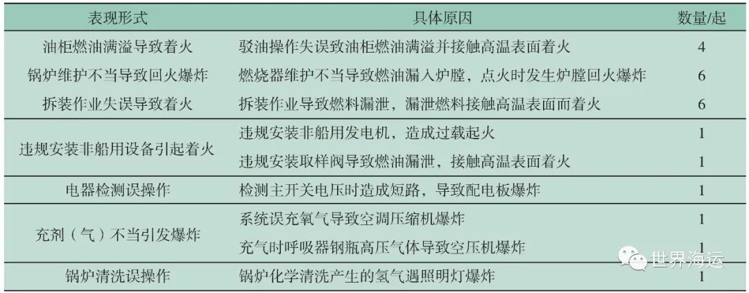 100起机舱火灾事故中,由操作性失误引起的共计22起。其表现形式包括:①驳油致油柜燃油满溢并接触点火源,共计4起;②锅炉燃烧器维护不当导致回火时爆炸,共计6起;③拆装作业失误导致燃料漏泄并接触点火源,共计6起;④违规安装非船用设备造成过载起火,共计2起;⑤电器检测误操作造成配电板爆炸,共计1起;⑥充剂 ( 气 ) 不当引发爆炸,共计2起;⑦锅炉化学清洗产生可燃气体遇点火源,共计1起。22起由操作失误引起机舱火灾具体情况见表3。