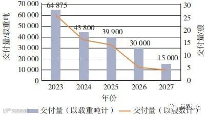 邮轮行业的发展与运输业、观光旅游业等息息相关,在全球新冠疫情扩散期间,邮轮行业也遭受到了沉重打击,美国、德国、英国、中国、意大利、加拿大等全球主要邮轮市场都出现了巨额亏损。从造船市场看,2022年邮轮订单共6艘、32万修正总吨,该数量与2021年基本持平,这较2019年的历史高点差距较大;从各船厂的手持订单情况看,未来5年预计有65艘邮轮陆续交付,其中,2023年预计交付26艘 ( 见图7 )。截至2021年底,欧洲沿海国家均已开放或有限开放邮轮访问,亚洲的日本、新加坡、土耳其、阿联酋、印度、印度尼西亚等国家和地区已不同程度地开放邮轮航行,另外,大部分的南北美及非洲国家均已开放邮轮访问。预计未来,随着全球疫情的逐步稳定,邮轮行业将迎来全面复苏。