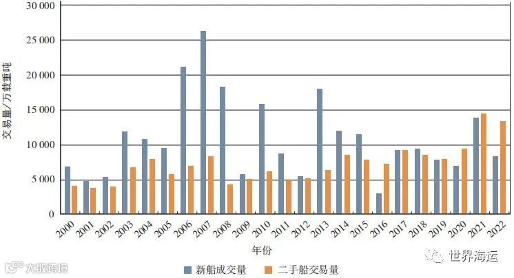 2022年世界新船价格指数在2021年高速增长后高位横盘,年末新船价格指数为162点,环比增长5.88%。近年世界新船价格综合指数变化情况见图1。世界造船业三大指标总体呈现“一升两降”态势。其中,造船完工量7 502万载重吨、2 751万修正总吨,与2021年同期相比分别下降13.5%、17.2%;新接订单量7 627万载重吨、3 911万修正总吨,同比分别下降44.3%、26.2%;年底手持订单量分别为22 397万载重吨、9 812万修正总吨,同比分别增长25.4%、23.2%。造船完工量和新接订单量均出现明显下滑,手持订单量大幅增长,反映出2022年造船企业仍然受到疫情等外部条件影响,复工复产存在阻力,而在宏观形势不确定性较强的背景之下,船东下单建造新船的热情相对不高,而二手船市场的交易则较为活跃 ( 见图2 )。近年来我国船舶修载比 ( 修正总吨/载重吨,通常用来比较不同单位下的高附加值船型比例 ) 提升,制造能力持续优化,核心船配市场也取得一定进展。未来,在排放标准日趋严格、传统动力船舶燃料替代的大背景下,大型船舶企业需要更为合理的经营策略来应对新形势下的激烈竞争。