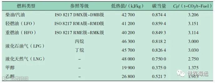 利用燃料中碳的质量分数 ( 碳当量 ) 以及CO2分子中碳和氧的质量比,可以计算得到燃料的碳转换系数。船舶在世界各地所加装的燃料的碳含量不尽相同,因此,碳转换系数最好由燃料供应商提供以更加精确。目前船舶使用的燃料等级已经标准化,各种燃料的碳转换系数也就相对固定。船舶常用的燃料类型及对应的碳转换系数见表2。