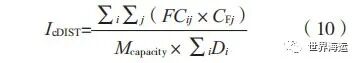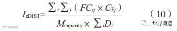 IMO各成员国提出各种EEOI替代指标,其中cDIST是基于供给的船舶运输工作量 ( 船舶装载能力和总航行距离的乘积 ) 来计算的营运碳强度指标,“c ”代表船舶装载能力,“DIST”代表总航行距离。计算周期内营运船舶滚动平均cDIST用式 ( 10 ) 表示: