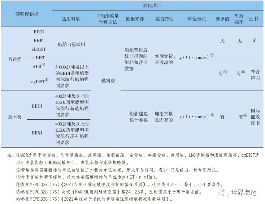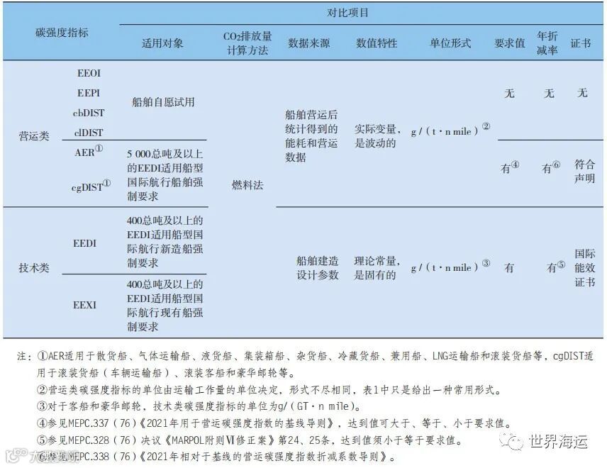 表1 国际航运碳强度规则下的营运类和技术类碳强度指标对比